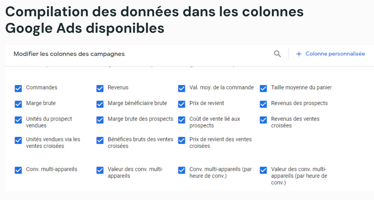 Ce calcul est généralement effectué dans votre CRM ou votre système de gestion des ventes. Ensuite, vous devez configurer un suivi personnalisé pour transmettre la valeur de la marge plutôt que celle du chiffre d'affaires brut.
